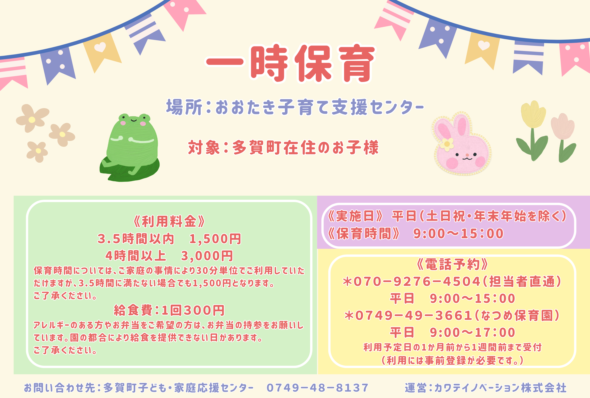 申し込み先は、070-9276-4504(担当者直通、平日午前9時から午後3時まで)、0749-49-3661(なつめ保育園、平日午前9時から午後5時まで)です。