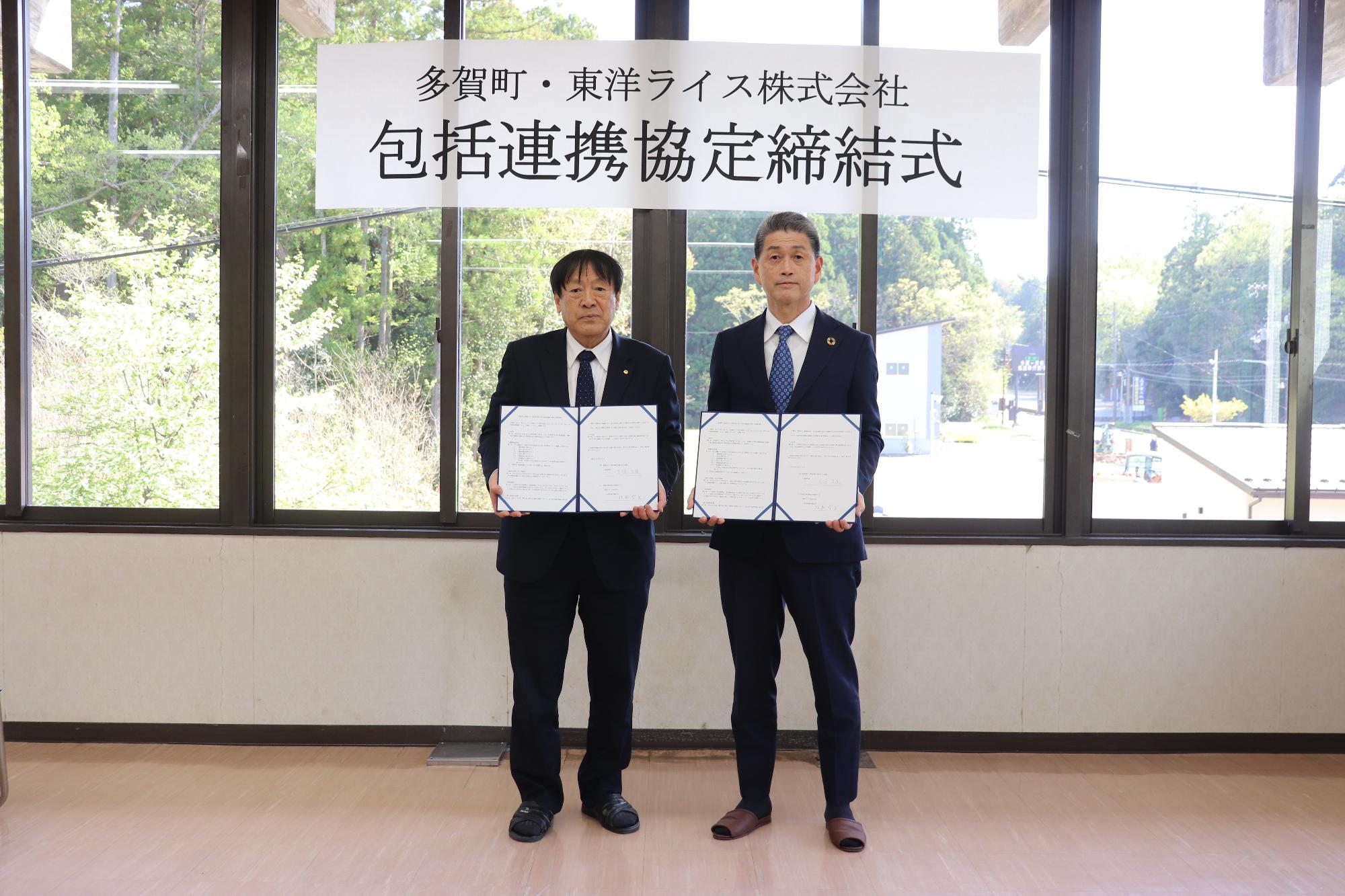 左から多賀町長 久保久良、東洋ライス株式会社代表取締役副社長 阪本哲生